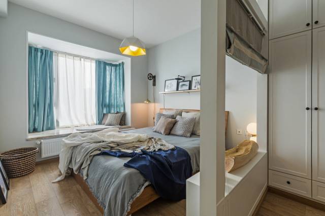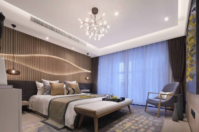 7、一般标准卧室的灯具距地面是2.1m,但如果有人在床的正上方设置吊灯,一定要注意当我们坐在床上或跪在床上时,吊灯距离你的头要留一段距离,不然容易碰头。