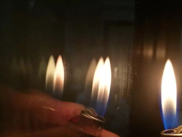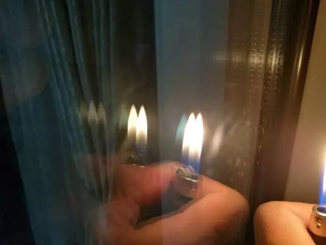 一个火焰会有三个影子。在有LOW-E膜的那面,第三个火焰影子发淡淡蓝,其他的都发红。而普通玻璃的三个火焰都发红,第三个火焰颜色只是很淡,在光线明亮时还看不到。看下图: